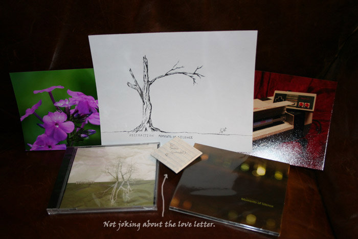 A physical copy of Moments of Silence, detailed above; my prior album, Nature's Echo and also a unique hand-inked version of the tree featured in the album art.